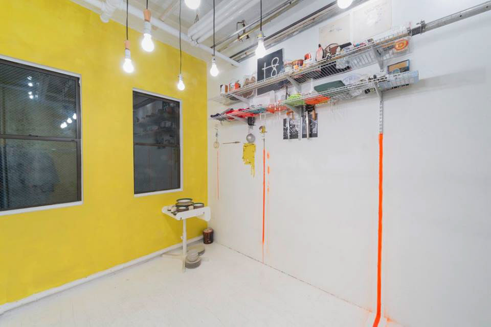 A little over a year later, Cordero is hosting the opening of his gallery’s latest show, “A groundbreaking, missed party,” which is a series of installed works by interdisciplinary artist and filmmaker Pedro Sanchez, who goes by PS3*. Since Cordero allows artists to use the entire space when assembling their exhibition, PS3* has painted the walls yellow and blue, hung a painted sheet of canvas inside a metal apparatus, and placed on another shelf a variety of mixed media objects, like a package of colorful plastic Easter eggs and a rainbow of gym shorts and a sparkling Christmas ornament and a stapler and what looks like yellow liquid latex that’s been nailed to the wall and a menagerie of other trinkets.
